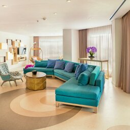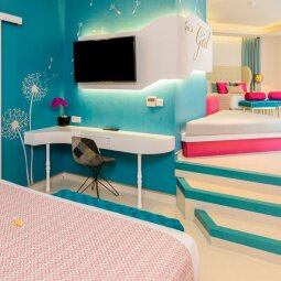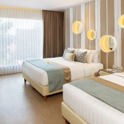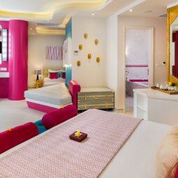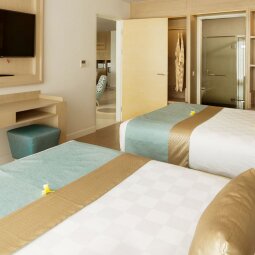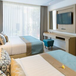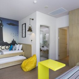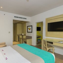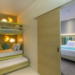 Семейный люкс площадью 60 кв. м и вместимостью до 5 человек. В числе удобств — балкон, а также главная спальная зона и детская зона, разделенные перегородкой. В люксе обустроена ванная комната с ванной, душем и бесплатными туалетно-косметическими принадлежностями, а также установлен телевизор с плоским экраном и международными каналами. Люкс расположен в 2 минутах ходьбы вдоль пляжа от главного здания. К услугам гостей: - Приветственный напиток и охлажденные полотенца по прибытии - 1 бутылка минеральной воды в день - Завтрак «шведский стол» - Разнообразные ежедневные мероприятия, в том числе занятия аэробикой, мастер-классы по кулинарии, батику, фигурной нарезке фруктов и многое другое - Ежедневное пользование услугами бизнес-центра (в течение 20 минут) и посещение лаунджа Cools - Подготовка постели ко сну - Посещение детского клуба/игровой площадки и ежедневные мероприятия для детей. За дополнительную плату можно заказать трансфер от/до аэропорта и взять напрокат снаряжение для немоторизованных водных видов спорта.