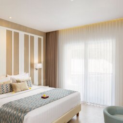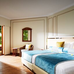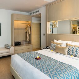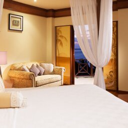 Просторный люкс с балконом. Здесь могут разместиться до 4 гостей. Площадь люкса составляет 60 кв. м. Главная спальная зона отделена от детской зоны. В люксе обустроена собственная ванная комната с ванной, душем и бесплатными туалетно-косметическими принадлежностями. В числе удобств телевизор с плоским экраном и международными каналами. Люкс расположен в 2 минутах ходьбы вдоль пляжа от главного здания. Гостям предоставляют следующие удобства и услуги: - приветственный напиток и холодные полотенца по прибытии; - 1 бутылка минеральной воды в день; - завтрак «шведский стол»; - ежедневные мероприятия, в том числе аэробика, кулинарные мастер-классы, уроки батика, нарезки фруктов и т.д.; - ежедневное пользование услугами бизнес-центра в течение 20 минут и доступ в лаундж Cools; - подготовка постели ко сну; - вход в детский клуб/на игровую площадку и ежедневные мероприятия для детей. За дополнительную плату возможна организация трансфера от/до аэропорта и предоставление снаряжения для водных видов спорта (кроме моторных средств).