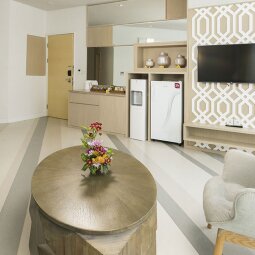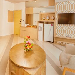 Семейный номер-студио вместимостью до 5 человек. В числе удобств — балкон, гостиный уголок и мини-бар. Этот номер-студио расположен в 2 минутах ходьбы вдоль пляжа от главного здания. К услугам гостей: - Приветственный напиток и охлажденные полотенца по прибытии - 1 бутылка минеральной воды в день - Завтрак «шведский стол» - Разнообразные ежедневные мероприятия, в том числе занятия аэробикой, мастер-классы по кулинарии, батику, фигурной нарезке фруктов и многое другое - Ежедневное пользование услугами бизнес-центра (в течение 20 минут) и посещение лаунджа Cools - Подготовка постели ко сну - Посещение детского клуба/игровой площадки и ежедневные мероприятия для детей. За дополнительную плату можно заказать трансфер от/до аэропорта и взять напрокат снаряжение для немоторизованных водных видов спорта.