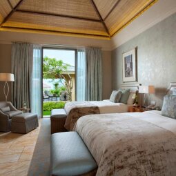 Всего в отеле 108 роскошных вилл с частными бассейнами: One bedroom villa (505 кв.м.), Family Villas (600 кв.м.) с двумя спальнями, Two-Bedroom Villas (1010 кв.м.), Presidential Villa (3300 кв.м.) имеет 3 спальни, оборудованную кухню, частную охрану, Mulia Mansion (3100 кв.м.) – 6 спален, оборудованная кухня, частная охрана. Каждая вилла уникальна декорирована, с уникальным ландшафтным дизайном тропического сада, уникальным бассейном, сделанным на заказ, которые не повторяют друг друга. Предоставляются услуги дворецкого.Специально для гостей есть клубный Living Room с библиотекой и рестораном.