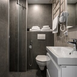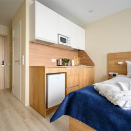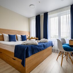 Просторные апартаменты с видом на Чёрную речку, предназначенные для комфортного размещения одного, двух или трёх Гостей. Номер оборудован кроватью-трансформером с ящиками для хранения, а кухонная зона укомплектована всей необходимой техникой, посудой и принадлежностями для приготовления кулинарных шедевров. Ванная комната оборудована душевой кабиной. Площадь апартамента позволяет установить дополнительное место.