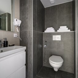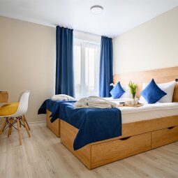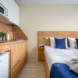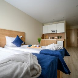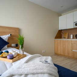 Апартаменты, прекрасно подходящие для размещения трёх человек. Номер оборудован кроватью-трансформером и раскладывающимся диваном, что делает его удобным для размещения семей. Кухонная зона оборудована необходимой техникой, укомплектована посудой и принадлежностями приготовления пищи. Ванная комната оборудована душевой кабиной.