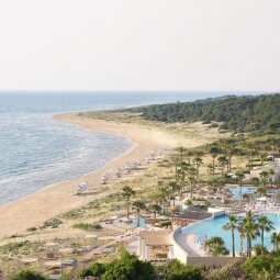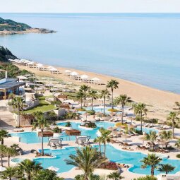 Пятизвездочный отель Grecotel Olympia Riviera с авквапарком и разнообразными удобствами расположен на территории площадью 202 га вдоль песчаного пляжа курорта Киллини длиной 2 км.
