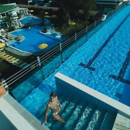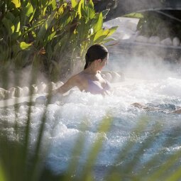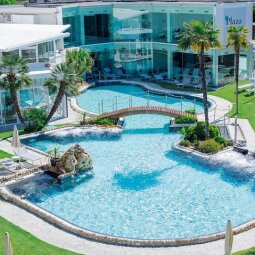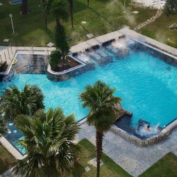 Один полуолимпийский бассейн с прохладной водой, дорожка Кнайп для улучшения циркуляции нижних конечностей, внутренний и внешний Джакузи с термальной водой, финская сауна в парке, а также уникальное вечернее шоу Sensory Pool, которое проходит ежедневно во внутреннем термальном бассейне до 23:30.