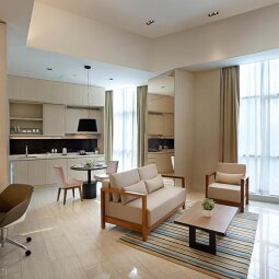 Стильный люкс площадью 54 кв.м. с кондиционером. Среди удобств гостиная зона с 47-дюймовым телевизором с плоским экраном, DVD-плеером и принадлежностями для чая/кофе. Собственная ванная комната укомплектована туалетно-косметическими принадлежностями.