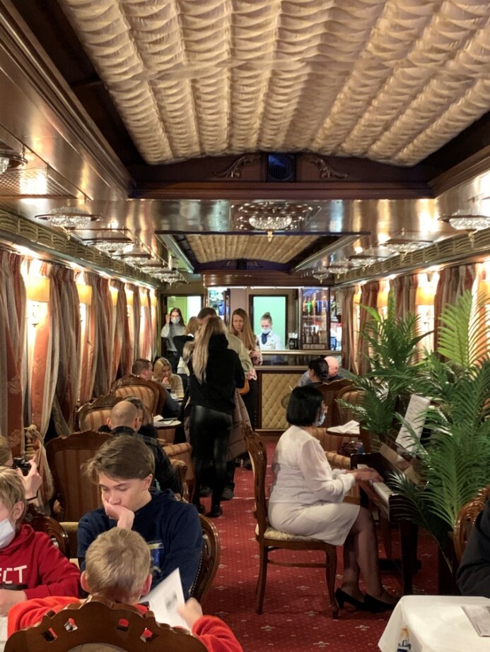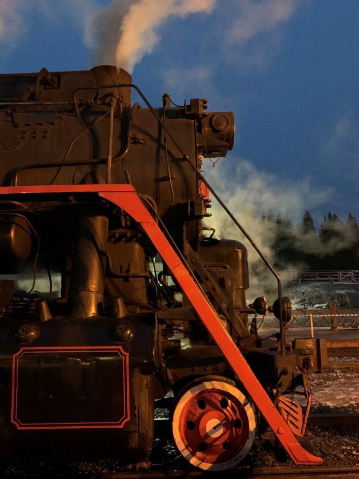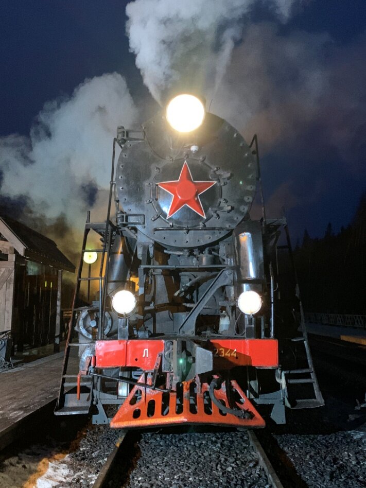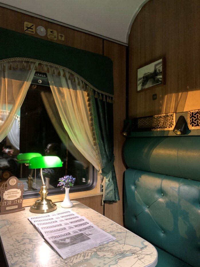 После экскурсии отправились на перрон к месту отправления Ретро-поезда: он за 55 минут доезжает до города Сортавала, а также на нем можно сразу уехать в Москву. Правда, только в купейном вагоне, и этот вагон такой один. По факту, основной состав – собственно, сам ретро-локомотив и вагоны - курсирует из Рускеалы до Сортавала и обратно, дальше в Сортавала всё ретро отцепляют, присоединяют обычные купейные вагоны, локомотив и отправляются в путь.
