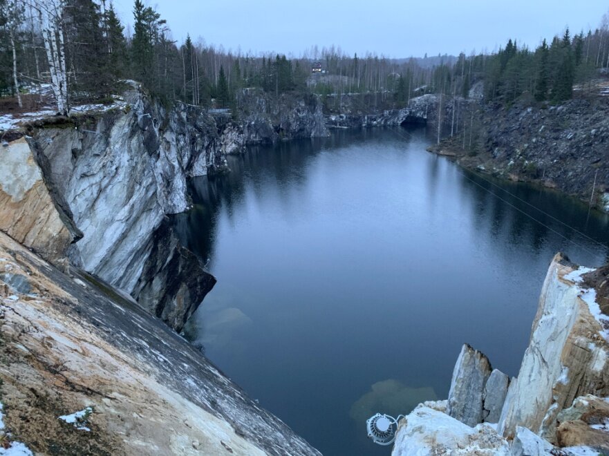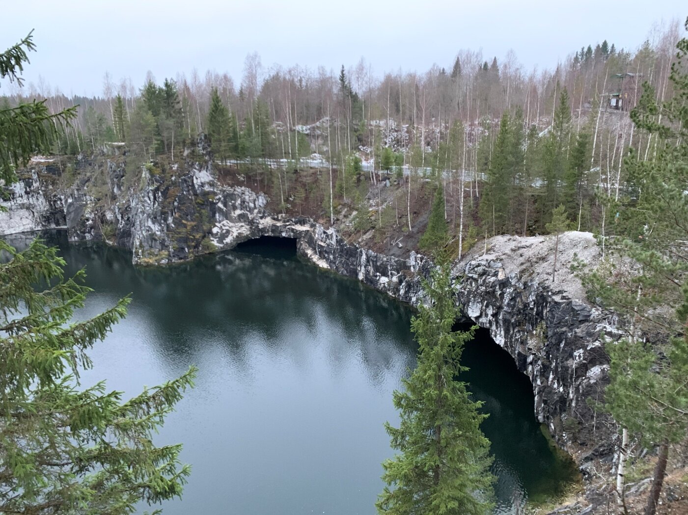 Далее мы поехали в горный парк Рускеала, он находится буквально в 10 минутах езды. У парка большая территория: несколько карьеров и кафе с разной кухней, детская площадка, троллей (zip-line), тарзанка, верёвочный городок, предлагаются дополнительные экскурсии «подземная Рускеала», «обитель ангелов», катание на лодке по «мраморному каньону». С этого года стали делать и подводную экскурсию с аквалангом. Очень много семей с детьми разного возраста, молодежи, пар.