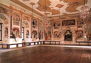 Masquerade Hall, probably the work of architect A. Altomonte with murals from 1748 by J. Lederer. The painter, inspired by the theatre's repertoire, portrayed scenes from Italian and French comedies dell arte with several of their characteristic figures.