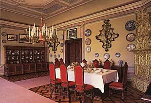 The Small Dining-room with practical and simple furniture of neo-Renaissance character has impressive mural decoration and a remarkable large collection of Chinese, Japanese and European porcelain.