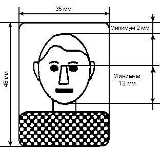 Содержать изображение лица, шеи и плеч, причем расстояние от переносицы до подбородка - минимально 13 мм, от головы (макушки) до верхнего края фотографии - минимально 2 мм